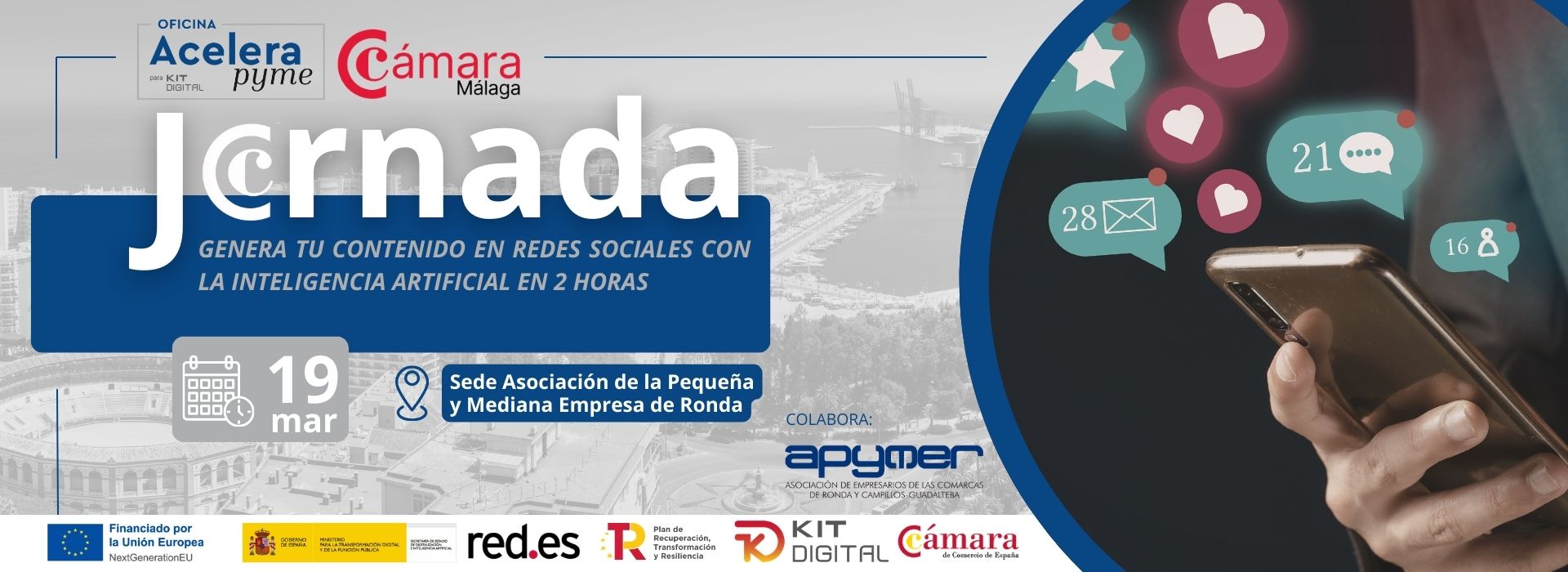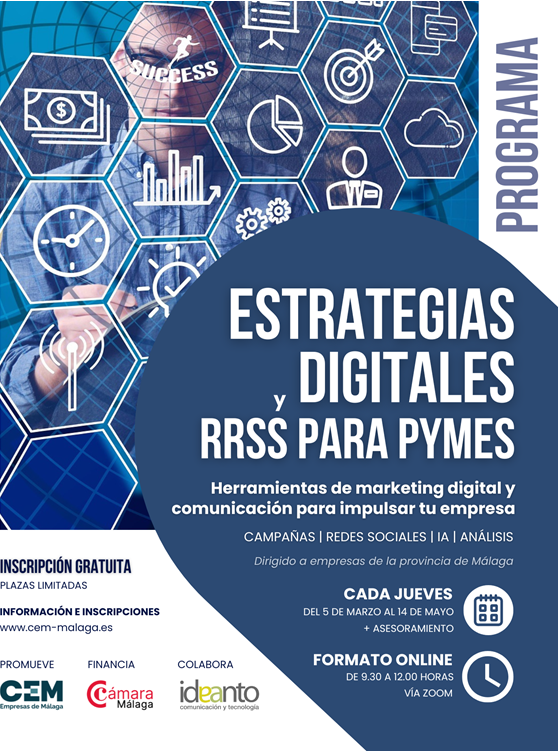 En el marco de las actividades que desarrollamos junto a la Confederación de Empresarios de Málaga, te invitamos a participar en el programa "Estrategias Digitales y redes sociales para pymes", que tendrá lugar en sesiones semanales del 5 de marzo al 14 de mayo, en formato online, de 9:30 a 12:00 horas. Esta actividad, de carácter gratuito previa inscripción, está dirigida a empresas malagueñas y…