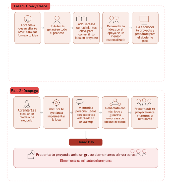 Contarás con el apoyo de tutores y mentores expertos que te guiarán en cada fase del proceso: desde la validación de tu idea hasta la definición de un modelo de negocio sólido y viable.